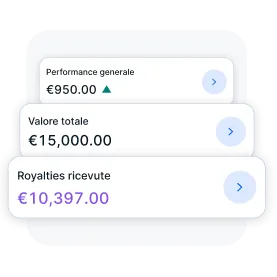 In qualsiasi momento e ovunque tu sia, puoi seguire l’andamento del tuo portafoglio, monitorare quali cataloghi distribuiranno royalties prossimamente, verificare la tua liquidità disponibile e monitorare il rendimento complessivo del tuo portafoglio.